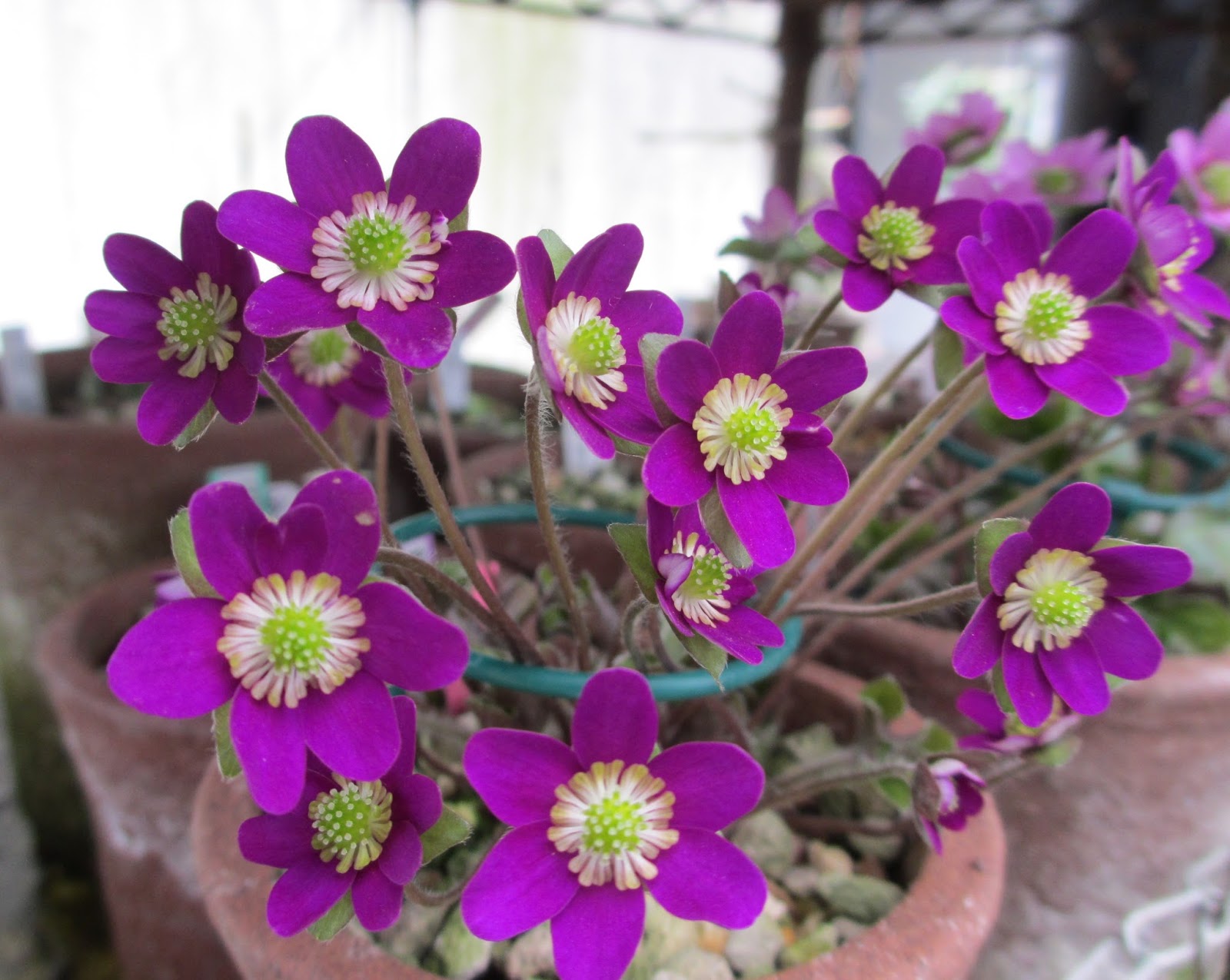 | カーポートの中の大株の雪割草、今が満開だ、、、。 |