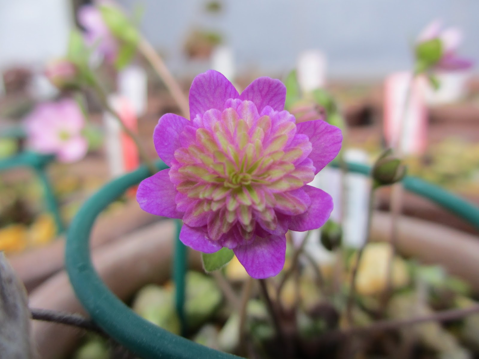 朝飯を食べてから山野草に水やりをする。水やりしながら先日降った雪を溶かしてやったが水をやってしばらくすると用土や花が凍り付いて居る。